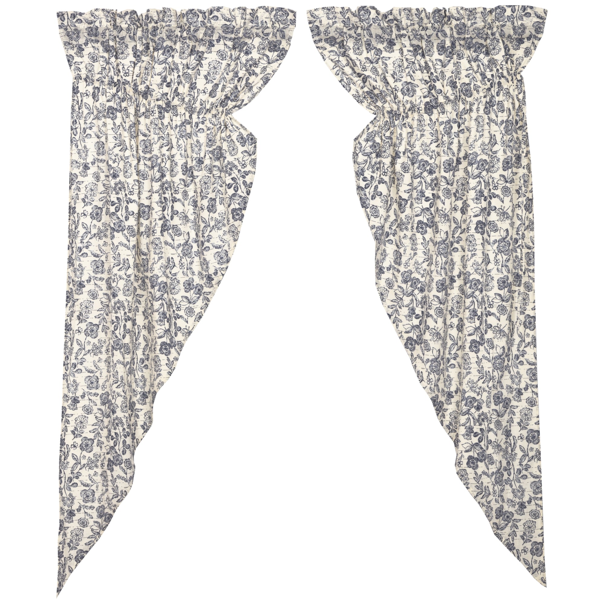 Set of 2 prairie style panels with adjustable drawstrings. Made from a pretty blue and cream floral print fabric with slub weave texture. Each panel 36" wide x 63" long on outer edge. 2" header and 3.25" rod pocket. Fully lined with white cotton. 100% cotton, machine washable. View the entire Doylestown Collection.