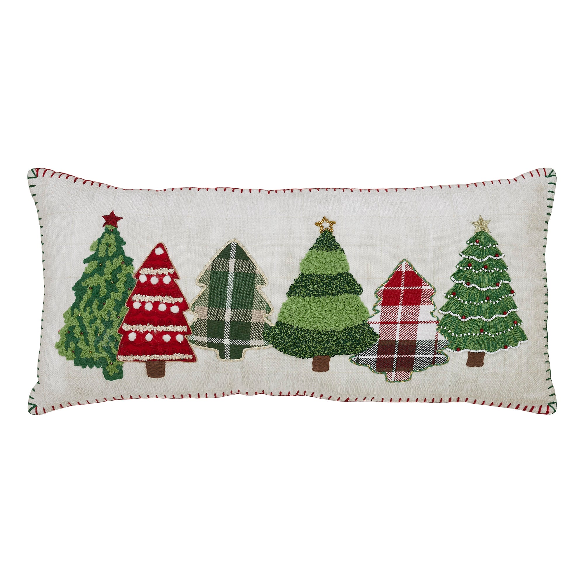 Decorate your sofa or bed with this lovely Christmas pillow by VHC Brands. It features festive Christmas trees, each uniquely appliqued and embroidered in traditional red and green tones on a soft creme fabric base. With its eye-catching holiday motifs, this pillow brings cheerful warmth to any room. Each tree showcases distinct seasonal accents such as bead embellishments, colorful trims, and puffy embroidery, adding texture and personality to the overall design. The handcrafted look is completed with red and green whip stitch edging, reinforcing the rustic, primitive style that's perfect for cozy holiday settings. Cover is not removable. Made in India. 14" x 30". View all Christmas Pillows.