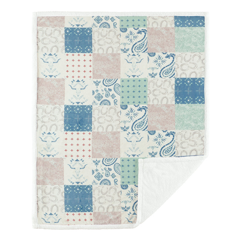 Cuddle up with this cute new throw blanket by Paseo Road. This design features an assortment of iconic Western symbols, including horseshoes, skulls, Aztec arrows and paisley prints. Colors are a soft palette of blush, sage, and French blue. Backed with plush sherpa for cozy warmth. Pairs perfectly with the Patchwork Paisley Quilt Set.