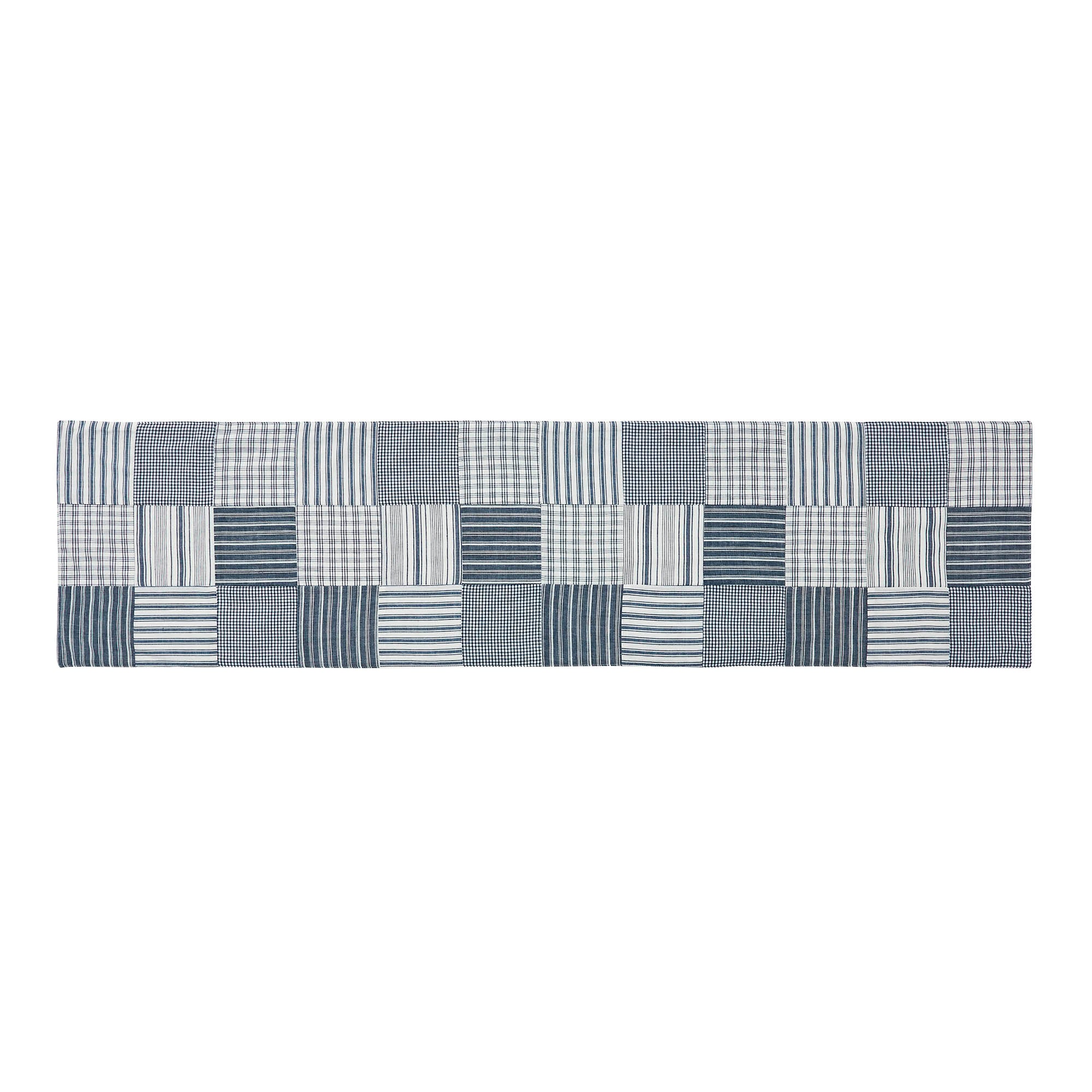Quilted cotton table runner made from a charming mix of denim blue and white fabrics. This patchwork design features ticking stripes, plaids and checks for a casual country look. Reverses to solid white fabric. Pair with matching window treatments and other accessories for a fully coordinated look. View the entire Sawyer Mill Blue Collection