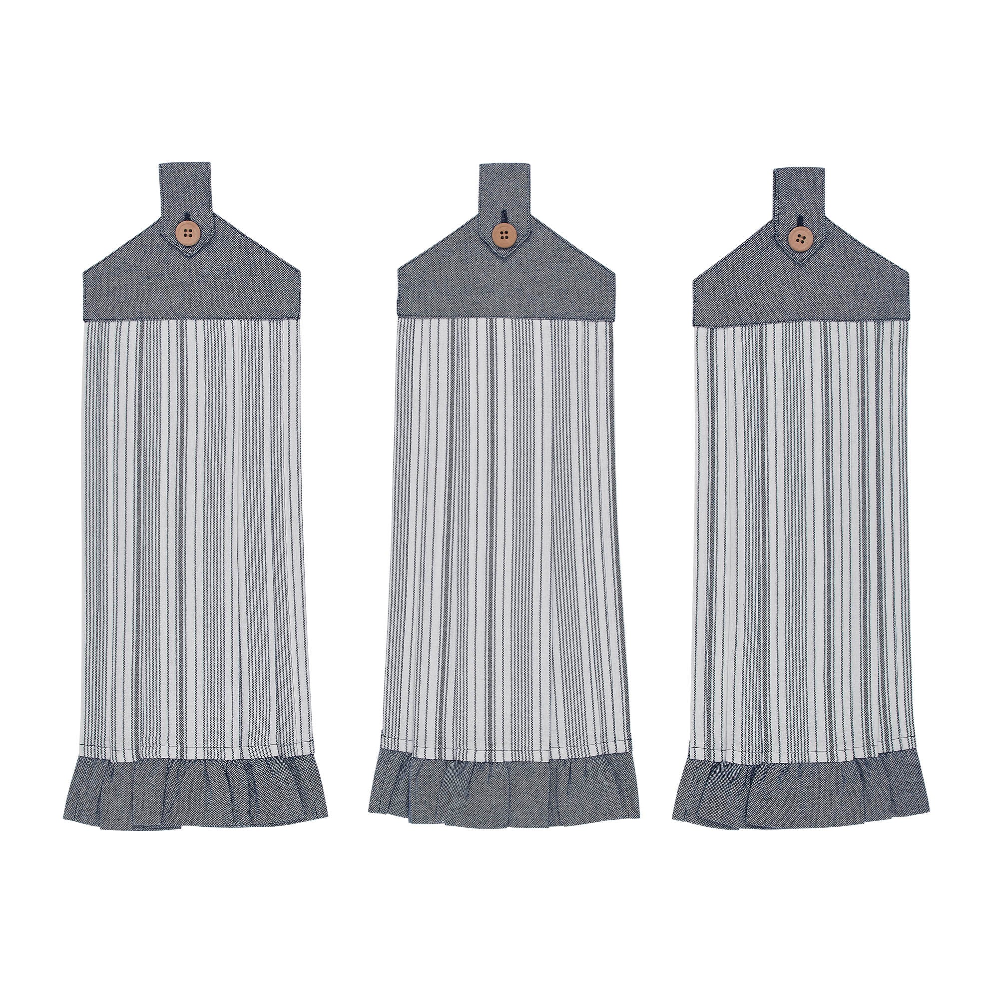 Add a dose of old fashioned country charm to your kitchen with these cute hanging towels! Not only are they adorable, they are useful too- hang them from your oven handle or cabinet hardware for a handy way to dry your hands in a hurry. Set of 3 towels with a pretty ruffled edge. Classic blue and white ticking stripe base, denim blue chambray ruffle and top. Mix and match with other Sawyer Mill Blue pieces for a fully coordinated look. View the entire Sawyer Mill Blue Collection.