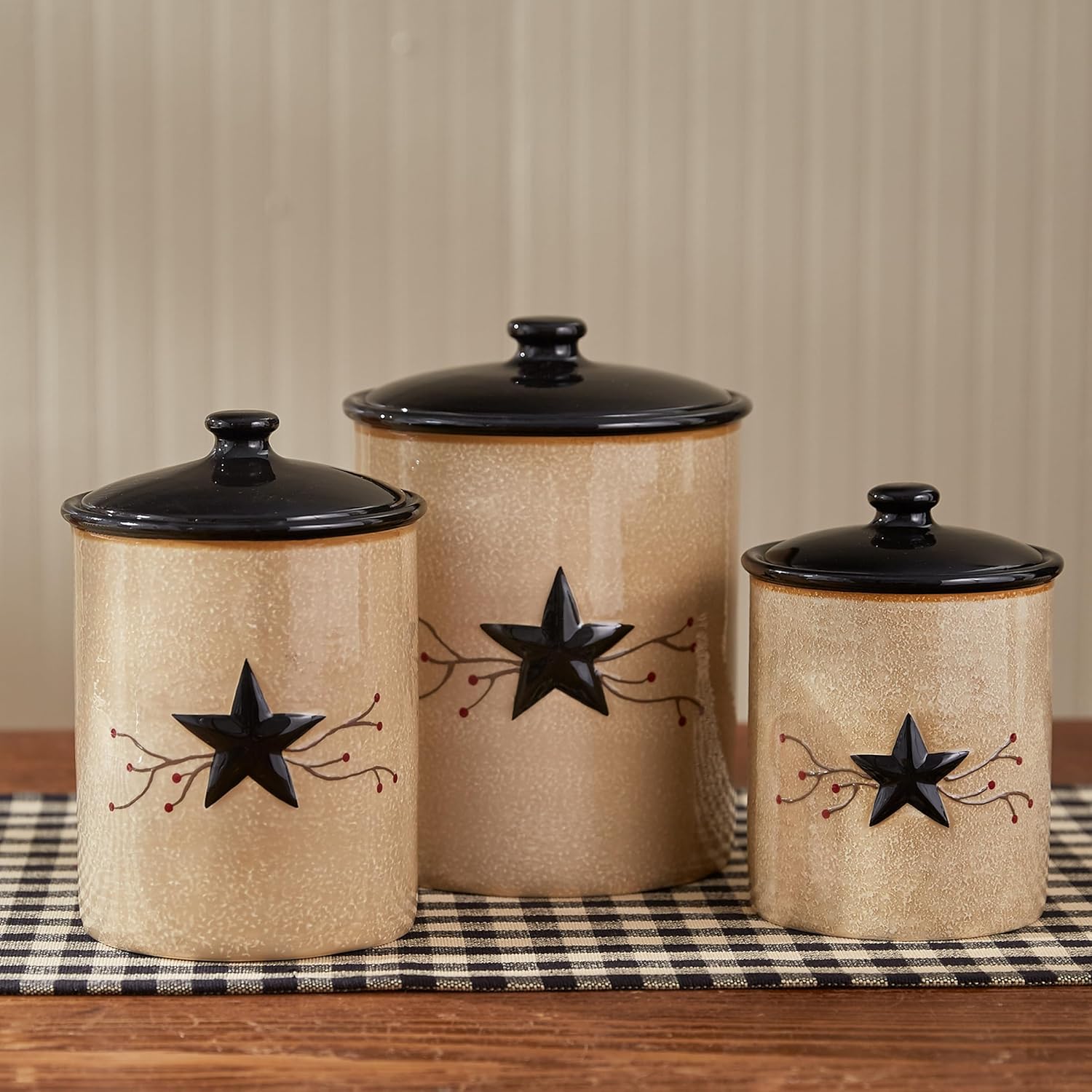 Made from durable ceramic with airtight silicone seals, these canisters keep ingredients fresh while adding a rustic touch to your countertop. With three versatile sizes and an easy-to-clean glazed finish, they offer stylish, space-saving storage for coffee, tea, sugar, and more. Perfect for your primitive style country kitchen!