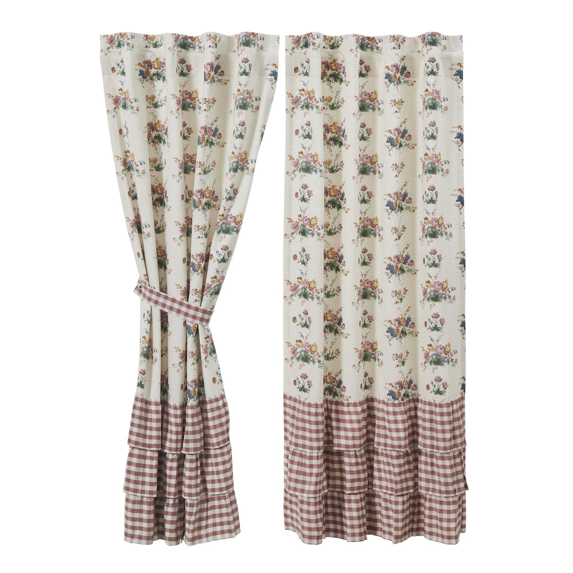This window panel set pairs a classic botanical print with a tiered, gingham check hem for a layered, vintage-inspired look. The triple-ruffled base adds significant texture and weight, helping the panels hang beautifully while bringing a sense of traditional cottage charm to any room. Tie-backs included. Designed with a 3.25-inch rod pocket and also hidden fabric loops on the reverse for a more tailored, pleated appearance. May be displayed using either hanging method. Fully lined with white cotton. Pairs beautifully with the matching bedding set. View the entire Rosehill Cottage Collection.