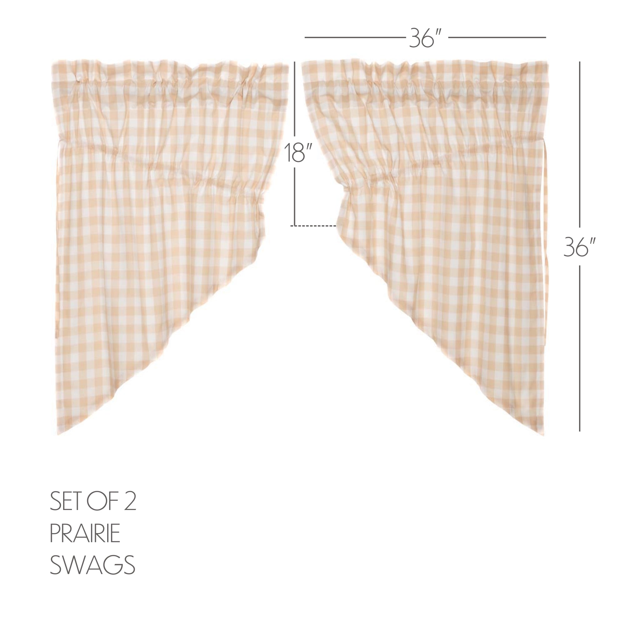 This Annie Buffalo Prairie Swag is made from a large scale tan and antique white fabric. 100% cotton, machine washable and lined with white cotton. This swag set includes 2 panels that are 36" wide x 36" long on the edges. Center drop is 18". Adjustable drawstring allows you to create the perfect amount of gathering to fit your window. Features 3.25" rod pocket and 2" header. View the entire Annie Buffalo Collection in Tan.