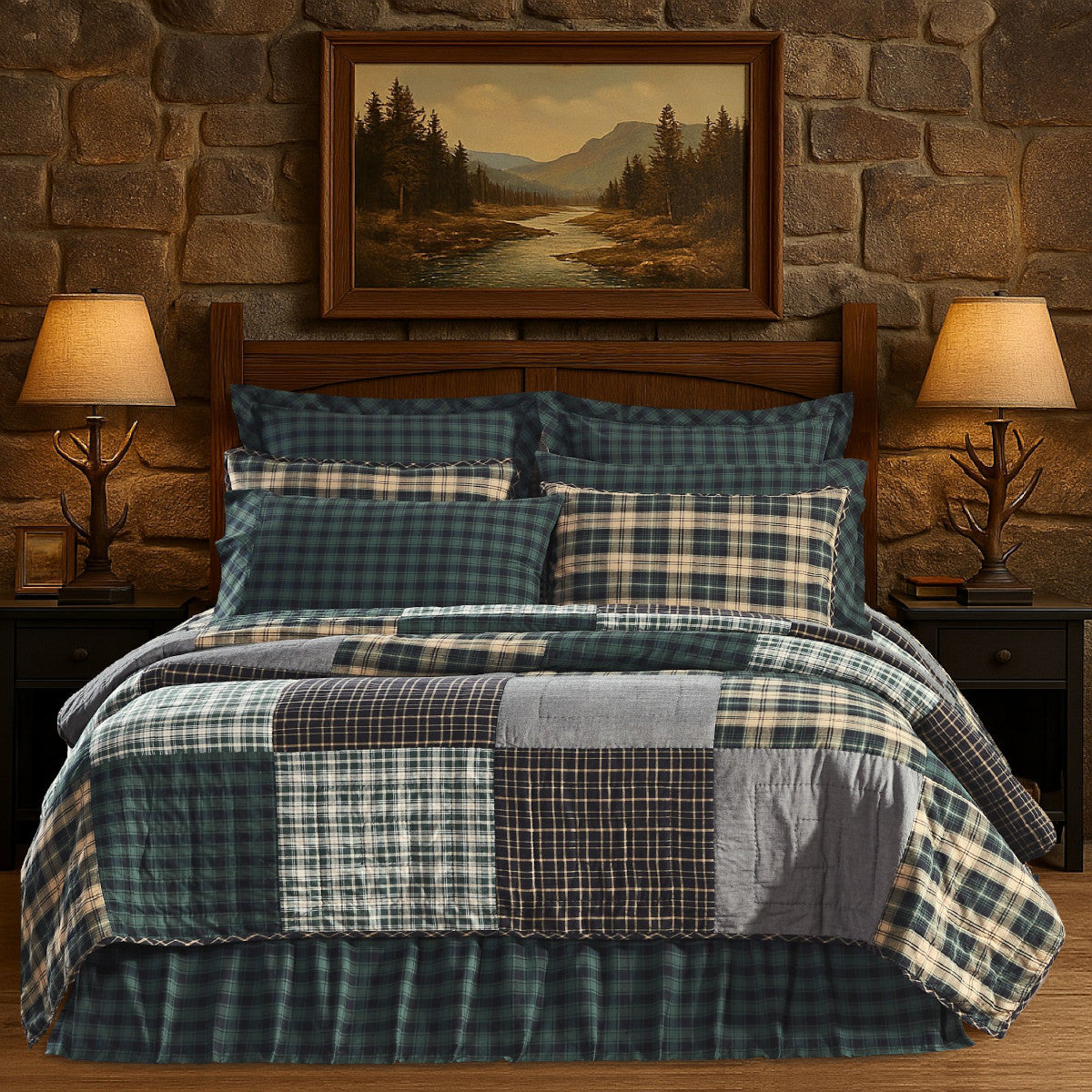Take a look at this rustic new quilt by VHC Brands. It features a mix of green plaid fabrics with touches of black, khaki and cream giving it a classic woodsy feel. All fabrics are 100% cotton with cotton batting for a cozy and breathable quilt. Matching accessories are available below. Machine washable. Made in India. View the entire Pine Grove Collection.